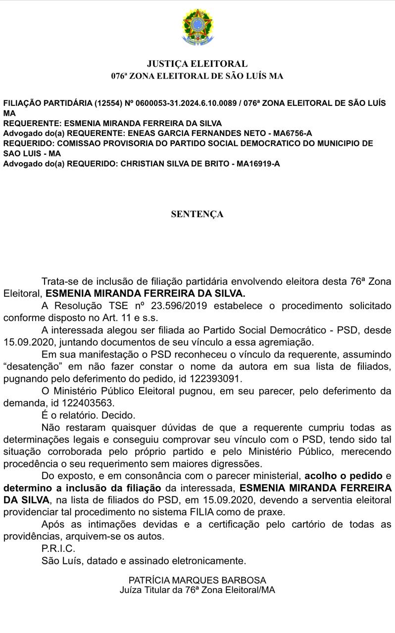 A juíza eleitoral Patrícia Marques Barbosa, titular da 76ª Zona Eleitoral de São Luís, determinou ao Partido Social Democrático – PSD a inclusão do nome da vice-prefeita Esmênia Miranda na lista de filiados da sigla, em 15.09.2020, devendo a serventia eleitoral providenciar tal procedimento no sistema FILIA como de praxe.