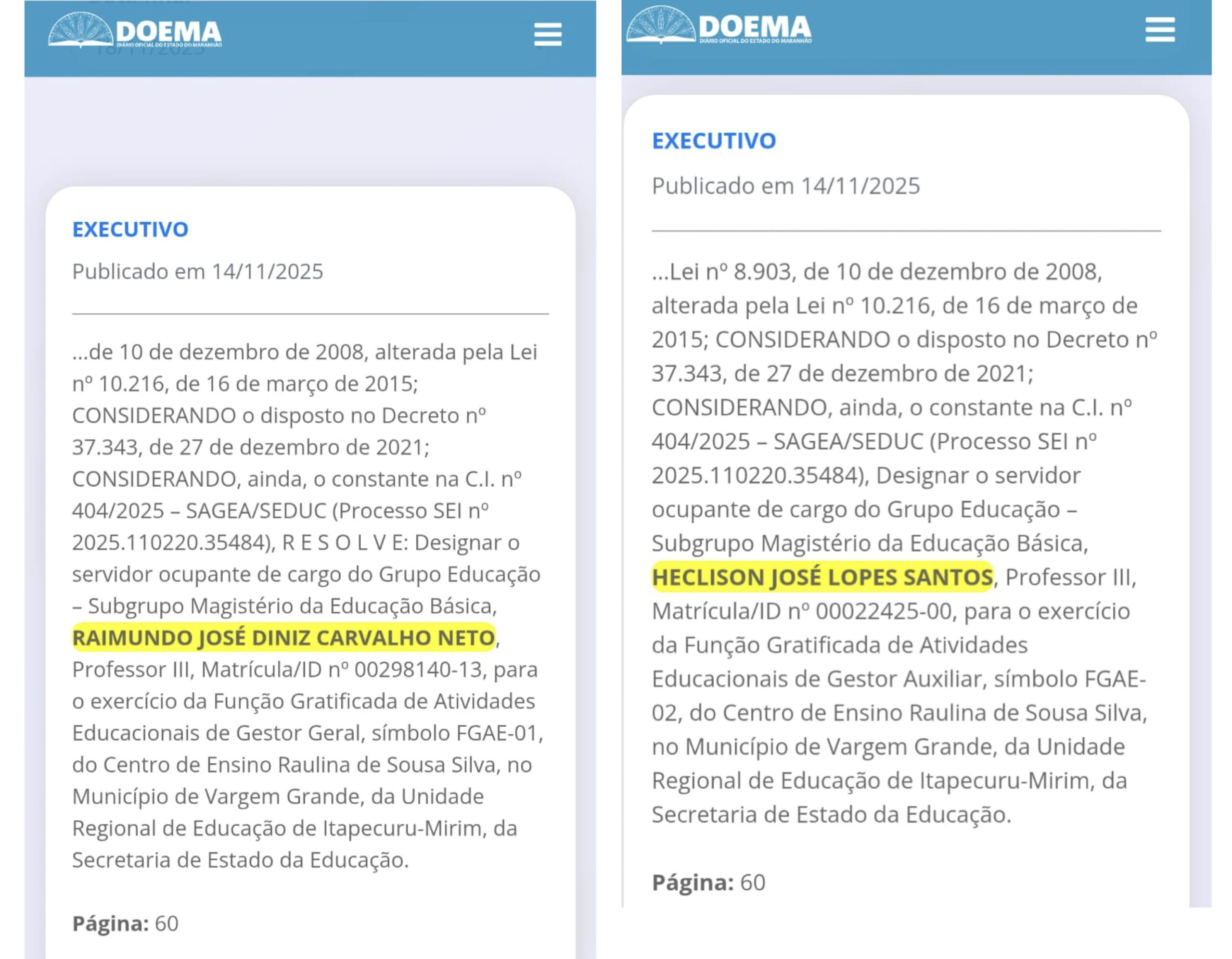 O Professor Raimundo José Diniz Carvalho Neto foi oficialmente nomeado pelo governador Carlos Brandão e pela Secretária de Estado da Educação, Jandira Dias Araújo Silva, como Diretor Geral do Centro de Ensino Raulina de Sousa Silva. Com ampla experiência na área educacional, o professor Neto Diniz já atuou como diretor geral do Centro de Ensino Professor Newton Neves, destacando-se por sua dedicação à gestão escolar e à melhoria da qualidade de ensino. Além disso, também foi oficializada a nomeação do professor Heclison José Lopes Santos como diretor adjunto do Raulina. Anteriormente, a escola era dirigida pela professora Cristiane Pontes, com