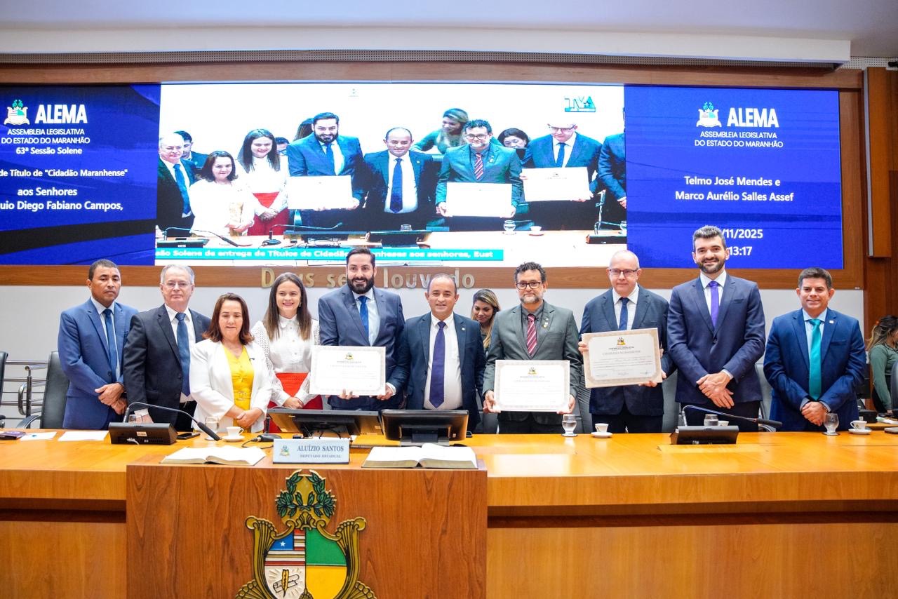 A Assembleia Legislativa do Maranhão realizou, na tarde desta terça-feira (18), sessão solene para a entrega do ‘Título de Cidadão Maranhense’ ao engenheiro civil e professor Telmo José Mendes e aos médicos Marco Aurélio Salles Assef e Eustáquio Diego Fabiano Campos. A cerimônia, realizada no Plenário Nagib Haickel, foi proposta pelo deputado Aluízio Santos (PL) e presidida pela deputada Fabiana Vilar (PL). “Reconhecemos trajetórias marcadas por compromisso e competência. Cada um, em sua área, tem ajudado a construir oportunidades e fortalecer o nosso Estado com trabalho sério e dedicação. Esta homenagem é, acima de tudo, um agradecimento do Maranhão a
