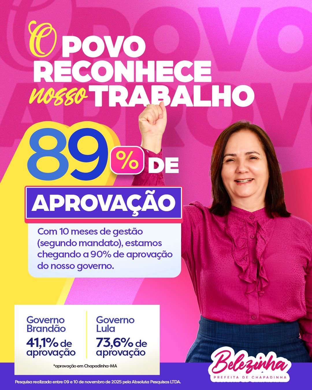 A prefeita de Chapadinha, Belezinha, alcançou um dos índices de aprovação mais altos já registrados no município: 89%, segundo pesquisa realizada pelo Instituto Absoluta Pesquisas nos dias 9 e 10 de novembro de 2025. O levantamento ouviu moradores da sede e da zona rural, reforçando a representatividade dos resultados. Com apenas 10 meses de gestão neste segundo mandato, a prefeita se aproxima da marca de 90% de aprovação — um índice raro no cenário político maranhense. O resultado reflete a percepção da população sobre o ritmo intenso de trabalho e o conjunto de ações implementadas pela administração municipal. Além do