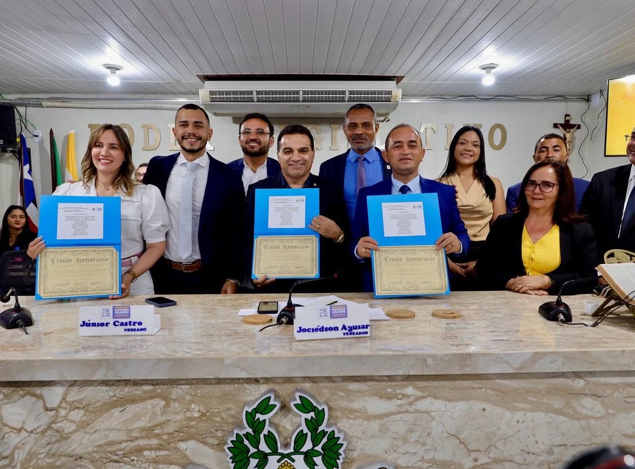 Foram homenageados Josimar, Detinha e Aluísio Santos, após proposições apresentadas pelos vereadores Dr. Junior Castro e Jociedson Aguiar A Câmara Municipal de Vargem Grande (CMVG) realizou, na noite desta sexta-feira (1º/8), sessão solene para entrega dos títulos de cidadãos vargem-grandenses aos deputados Josimar, Detinha e Aluízio Santos, ambos do PL. Os vereadores Jociedson Aguiar (PL) e Dr. Júnior Castro (Republicanos) foram os responsáveis pela organização da cerimônia, que foi muito prestigiada. Estiveram presentes à solenidade, a prefeita de Chapadinha, Belezinha (PL); autoridades, familiares e amigos dos homenageados. A condecoração é a maior honraria que o Legislativo pode prestar a um