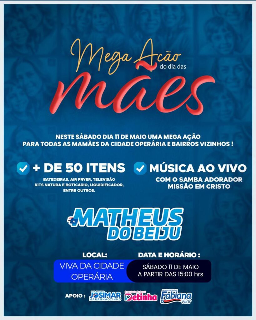 O jovem empresário e político, Matheus do Beiju, vai realizar neste sábado, 11, a Mega Ação do Dia das Mães. O evento acontecerá a partir da 15h no Viva da Cidade Operária com sorteios de diversos itens, bem como: TV’s, batedeiras, liquidificadores, Air Fryer, kits de perfumaria da Natura e O Boticário, dentre outros. A […]