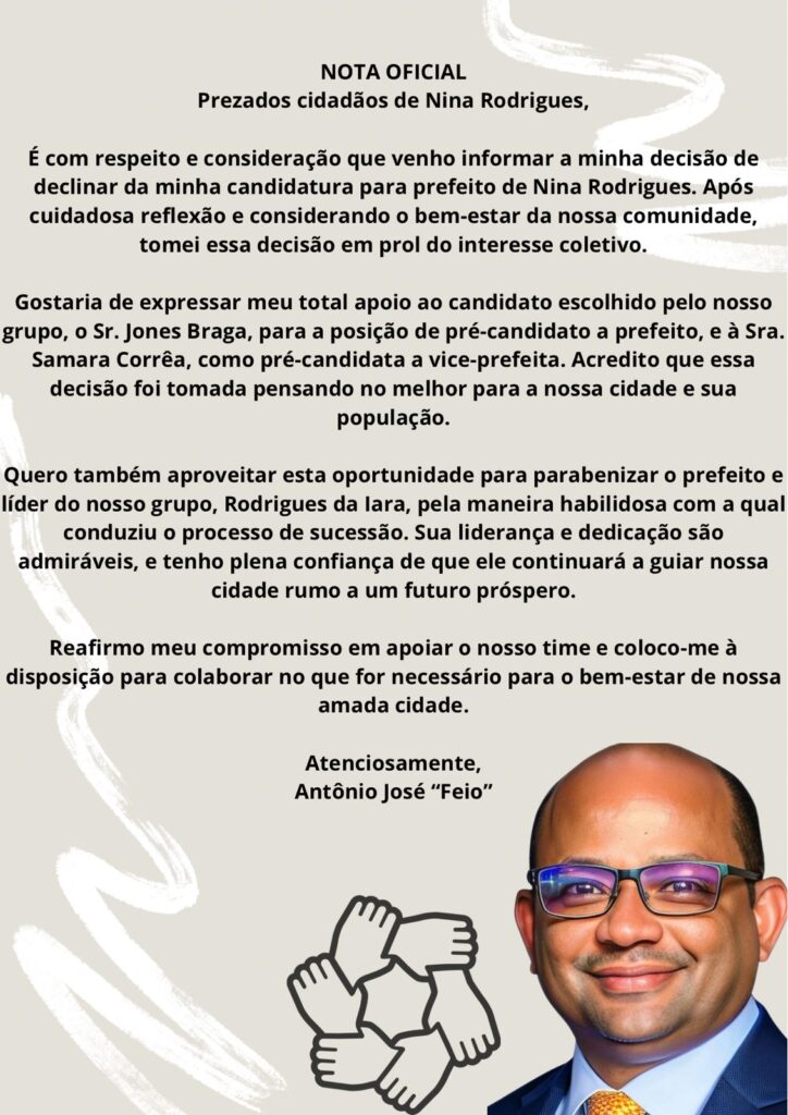 Prezados cidadãos de Nina Rodrigues, É com respeito e consideração que venho informar a minha decisão de declinar da minha candidatura para prefeito de Nina Rodrigues. Após cuidadosa reflexão e considerando o bem-estar da nossa comunidade, tomei essa decisão em prol do interesse coletivo. Gostaria de expressar meu total apoio ao candidato escolhido pelo nosso […]