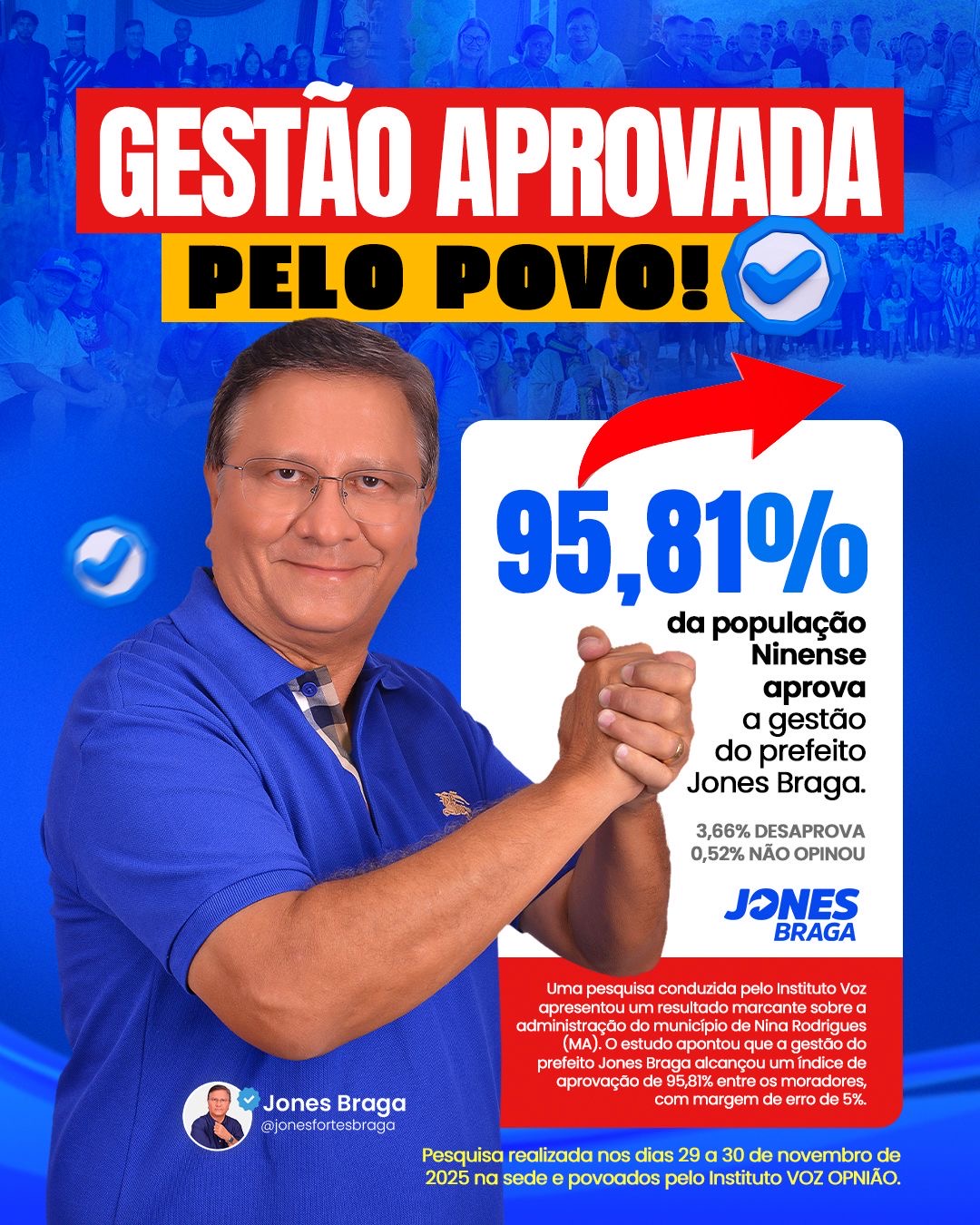 A mais recente pesquisa do Instituto Voz confirmou um cenário de forte aprovação popular à administração do prefeito Jones Braga. De acordo com o levantamento realizado entre os dias 29 e 30 de novembro de 2025, 95,81% da população de Nina Rodrigues avalia positivamente a gestão municipal, índice que reforça a confiança depositada pelo povo no trabalho desenvolvido ao longo dos últimos 11 meses. Apenas 3,66% desaprovaram e 0,52% não opinaram.