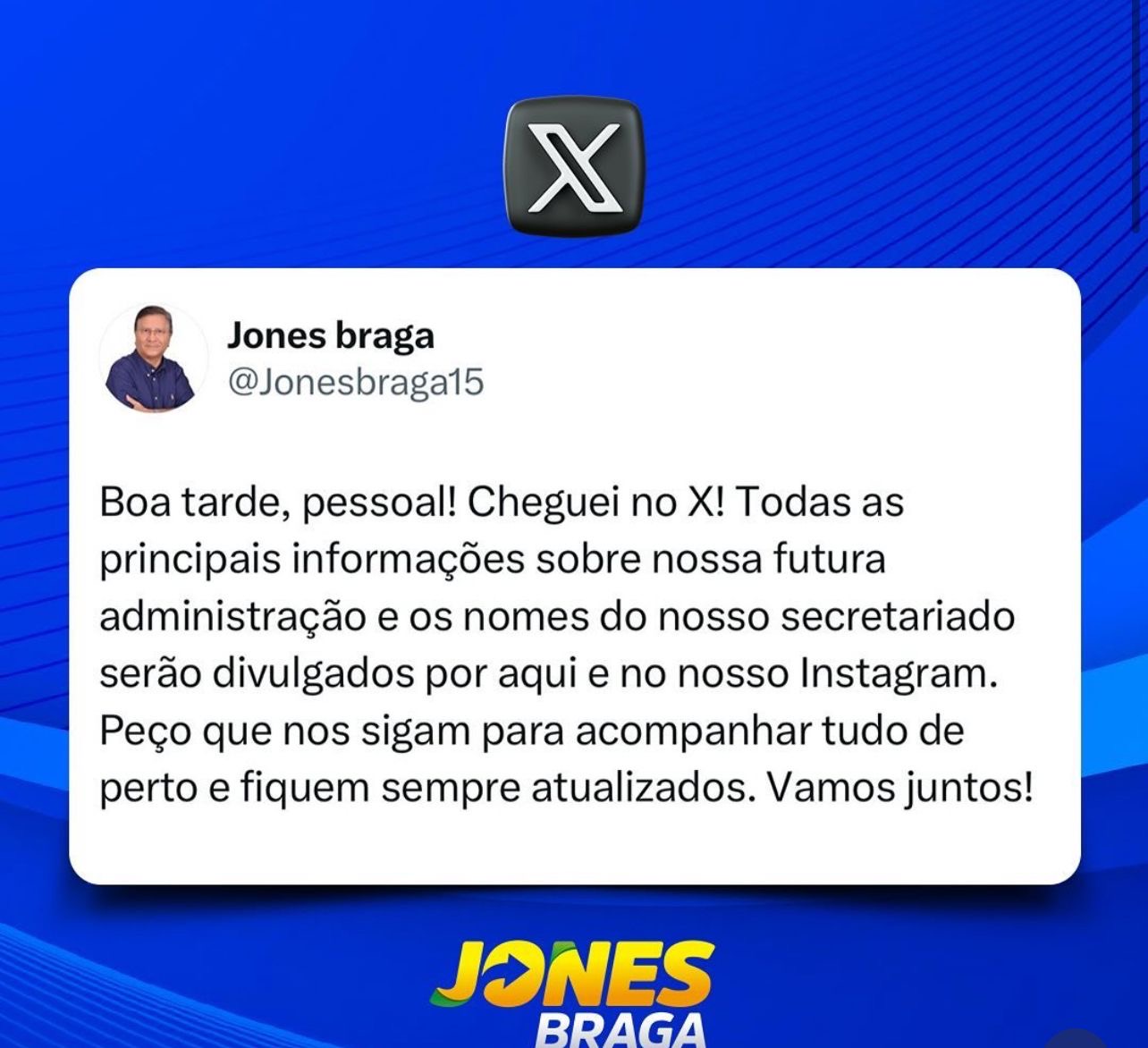 Depois de instituir a equipe de transição, o prefeito eleito Jones Braga (MDB) anunciou seu ingresso no aplicativo de mensagem, o microblog “X”, antigo twiter. De acordo com Jones, todas informações inerentes a sua gestão, bem como também, a divulgação do seu secretariado, que terá início a partir do mês de novembro, acontecerão por suas redes sociais. Articulação na capital Em São Luís, o prefeito eleito e o atual se reuniram para tratar do futuro de Nina Rodrigues, com a deputada e presidente da Assembleia Legislativa, Iracema Vale (PSB), com a deputada federal Roseana Sarney (MDB) e com o empresário