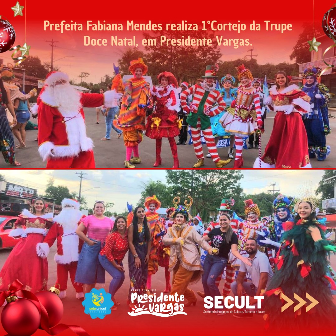 A prefeita Fabiana Mendes investindo em um natal inesquecível para os munícipes, realizou na tarde dessa segunda-feira (19), por meio da Secretaria Municipal de Cultura, o 1°Cortejo da Trupe Doce Natal em Presidente Vargas. O evento, contou com um desfile que iniciou na Praça Walter Ferreira, seguindo pela Avenida e Rua principal da cidade, encerrando no Balneário Orestes Lima, onde há a decoração predominante natalina da cidade.